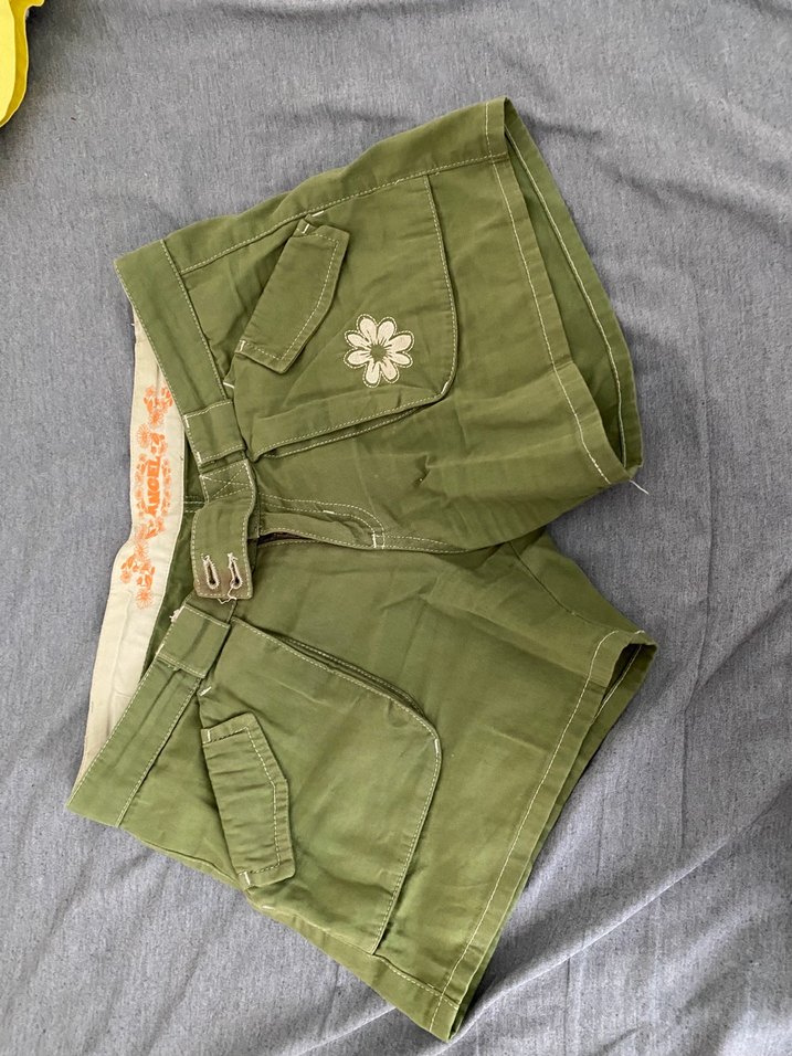 Düğmeli, yeşil pamuk midi şort.
