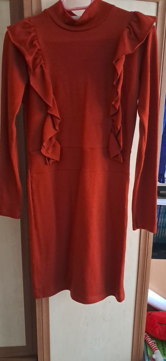 , uzun kollu ve bisiklet yakalı, fırfır detaylı, dar kesim midi triko elbise.