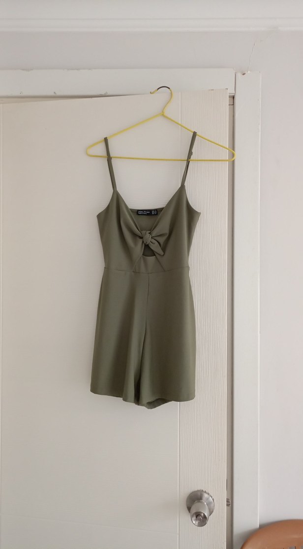 Kadınlar için askılı, kemerli ve ön düğüm detaylı mini tulum. Yumuşak sentetik kumaştan, günlük sokak stili için uygundur.