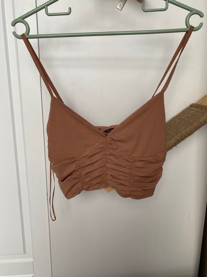 İnce askılı, önü büzgülü, minimalist ve sokak tarzı esintili koyu bej renkte kadın mini bralet.