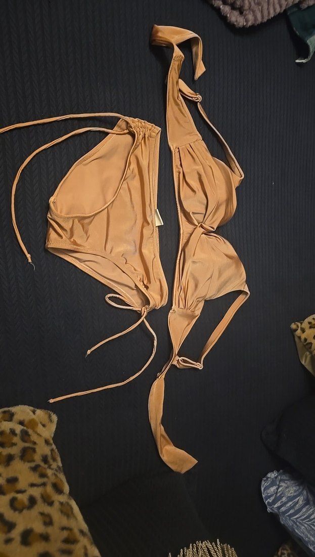Bej renkli, dar kesim, askılı ve kemerli kadın bikini takımı. Mini kısa boyda, günlük kullanıma uygun bohem ve avangart tarzda.