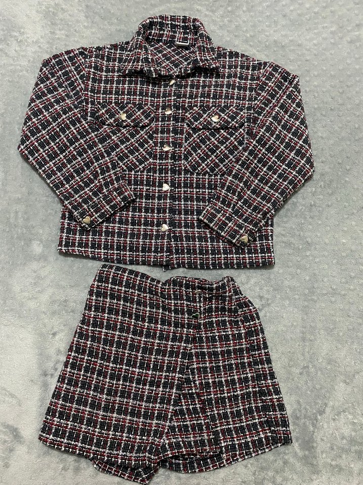 Kadınlar için regular fit ve kısa boy tasarımlı takım. Düğmeli, uzun kollu, çentikli yakalı ekose ceket ve uyumlu mini şortlar sentetik kumaştan. Koyu çok renkli desen, Paris sokak modasına uygun günlük kullanıma uygun.