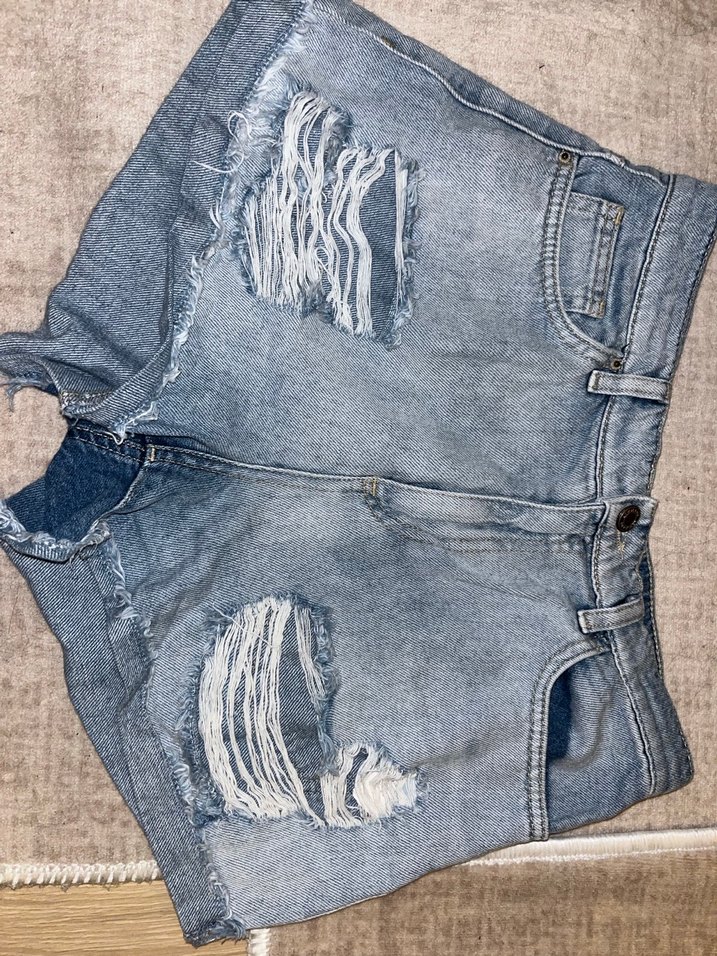 yırtık detaylı ve kemerli kadın kot mini şort, rahat sokak stili için uygundur.