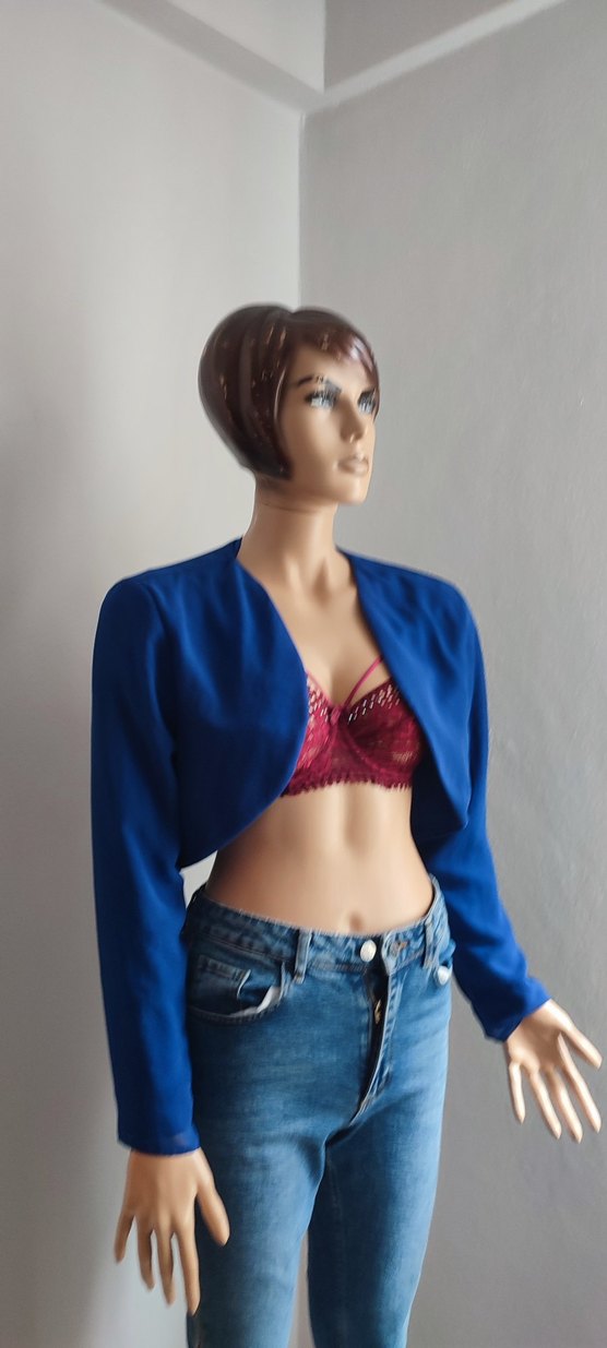 Kadınlar için koyu mavi denimden yapılmış, kısa kesim ve düğmeli, uzun kollu, yakalı ve vücuda oturan blazer. Günlük kullanıma uygun, cesur Paris tarzı.