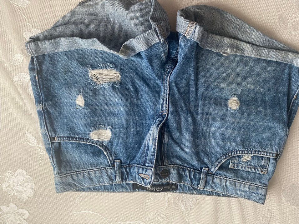 Düğmeli, bol kesim mini mavi denim şort, parlak renkte ve yırtık detaylı, günlük rahat sokak stiline uygun.
