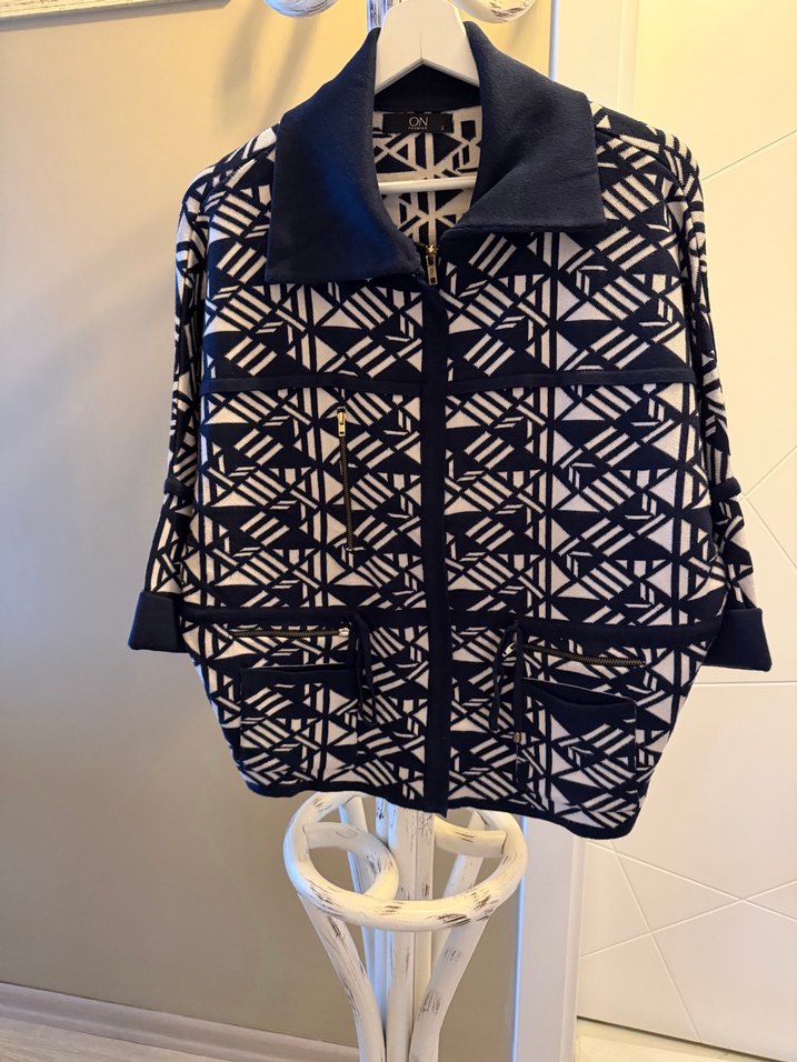 Kadınlar için kısa, örgü dokulu, koyu mavi baskılı geometrik desenli ceket. Yüksek yakalı, uzun kollu ve bol kesim, çağdaş ve Paris tarzı avant-garde görünüme sahip.