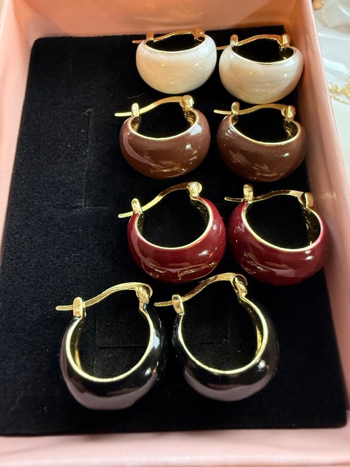 Parlak yüzeye sahip mini halka küpe seti; koyu kahverengi, krem, bordo ve siyah renklerde, bohem Paris tarzını yansıtır.