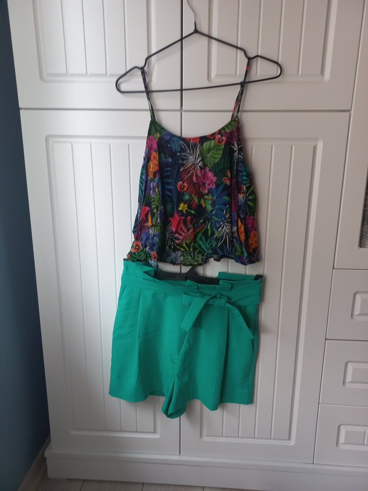 Kadınlar için kemerli, askılı ve straplez yaka detaylı, bol kesim kısa yeşil tie-dye desenli buluz ve sort