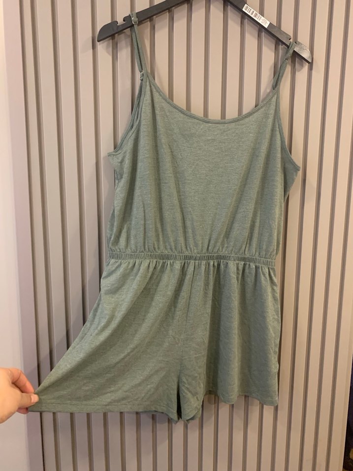 Yeşil renginde askılı ve bol kesim kadın mini tulum, günlük sokak stili için uygundur.