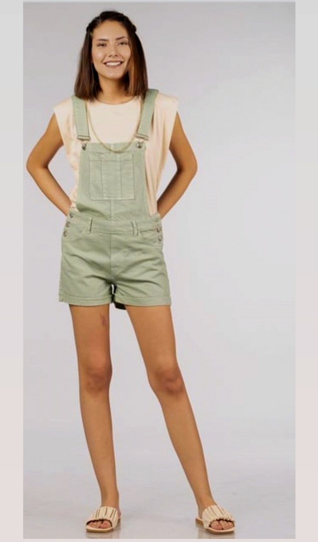 Pamuklu mint yeşili renkli, kısa ve bol kesim tulum, kolsuz ve yuvarlak yaka tişörtle kombinlenmiş, rahat sokak stiline uygun. marka temsilidir