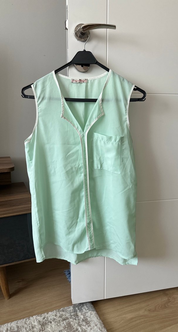 Mint yeşili renkli, pamuklu kumaştan üretilmiş, V yaka, kolsuz bluz. Rahat kesimi ve tek göğüs cebiyle günlük sokak stili için uygun.