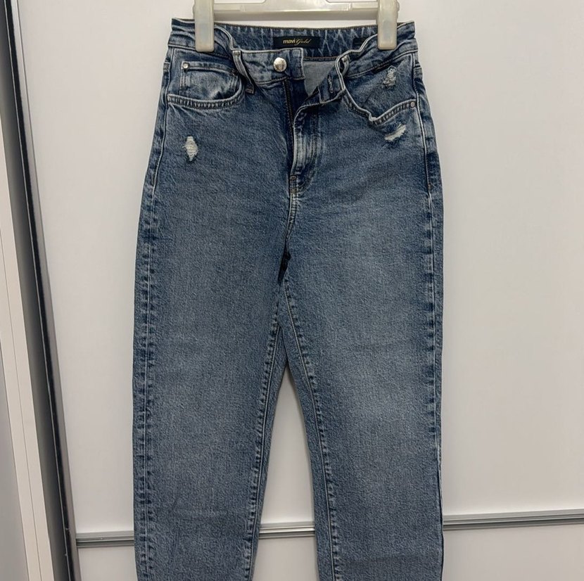 Mavi denim, normal uzunlukta, regular kesim ve tokalı detaylara sahip kadın pantolon. Hafif yıpranmış görünümüyle günlük kullanıma uygun. 26/29 yazıyor beden