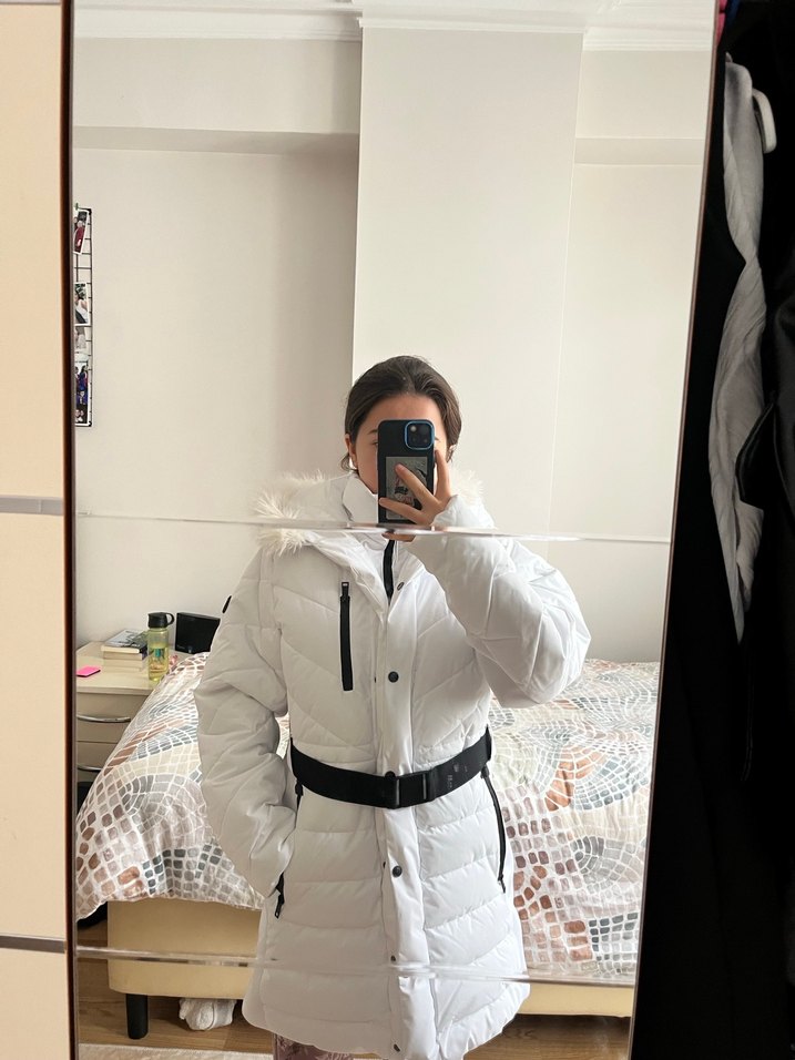 Yüksek yakalı, kemerli ve soft sentetik kumaştan beyaz fitted midi kışlık mont. Rahat ve şık sokak stili, günlük kullanıma uygun. ❄️