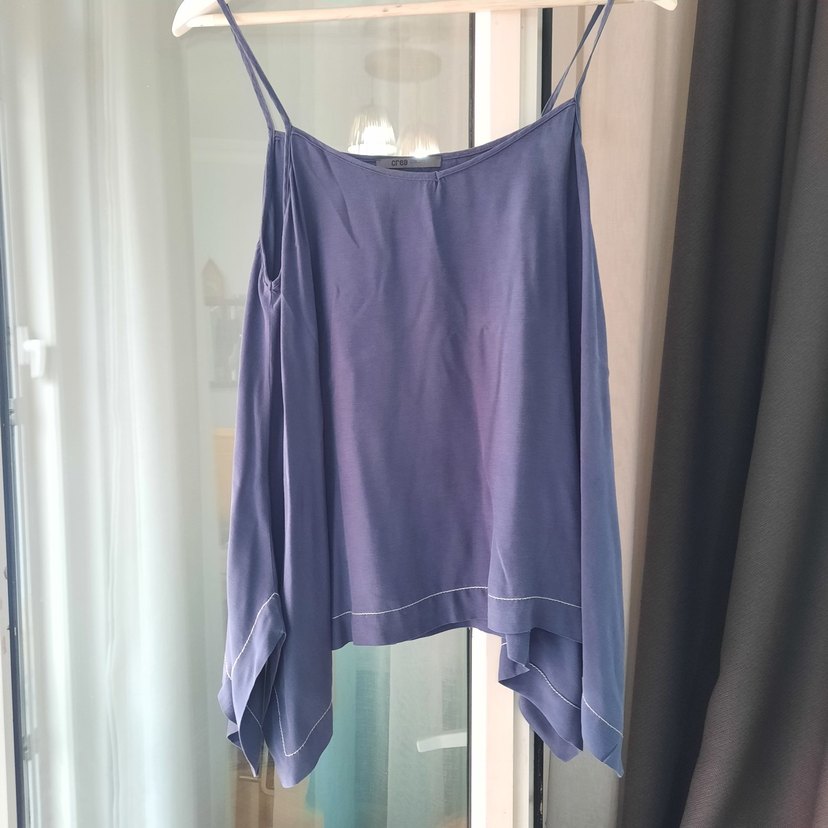Mor askılı, salaş kesim, drapeli ve satenimsi kumaştan yapılmış kadın bluzudur. Normal midi boyda, desen içermeyen günlük kullanıma uygundur.