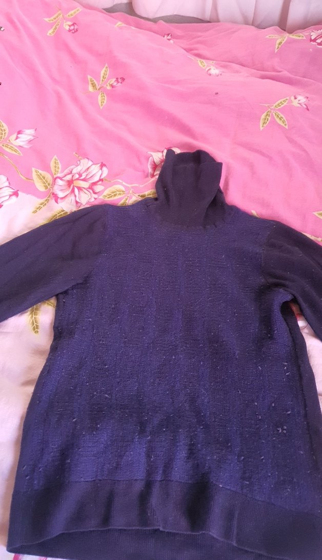 Mor renkli, balıkçı yaka ve uzun kollu, triko dokuma kumaştan yapılmış, normal boyda ve vücuda oturan kadın kazak.