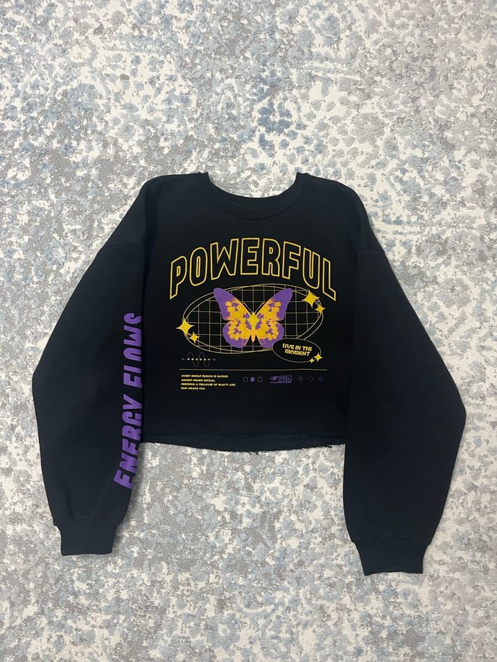 Kadınlar için mor renkli, bol kesim, uzun kollu ve yuvarlak yaka sweatshirt. Önünde "POWERFUL" yazısı ve kelebek baskısı bulunu