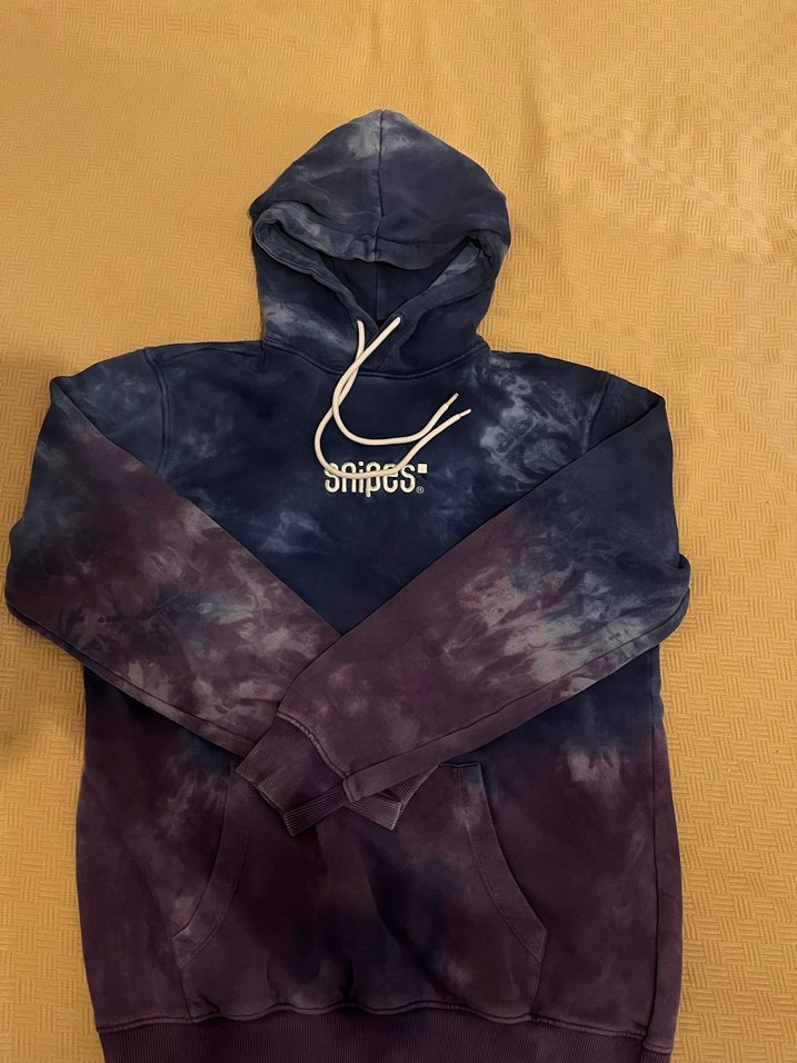 Kadınlar için mor batik desenli, kapüşonlu, uzun kollu ve bol kesim sweatshirt. Yumuşak ve sıcak kumaştan, günlük kullanıma uygun.