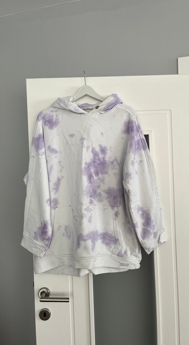 Kadınlar için rahat kesim, uzun kollu ve kapüşonlu pamuklu sweatshirt. Pastel mor batik deseniyle günlük kullanım için şık ve rahat bir tercih.