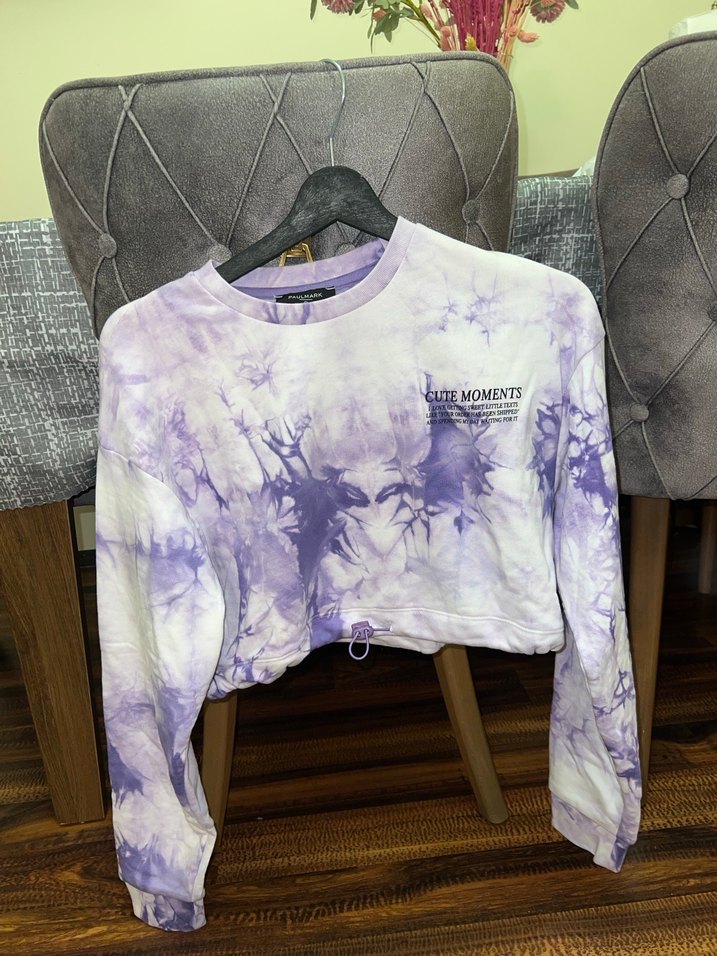 Bu kadın sweatshirtü, pastel mor batik deseni, uzun kollu ve yuvarlak yaka ile bol kesimdir. Pamuklu yumuşak kumaştan yapılmış, düğme detaylıdır ve günlük kullanıma uygundur.