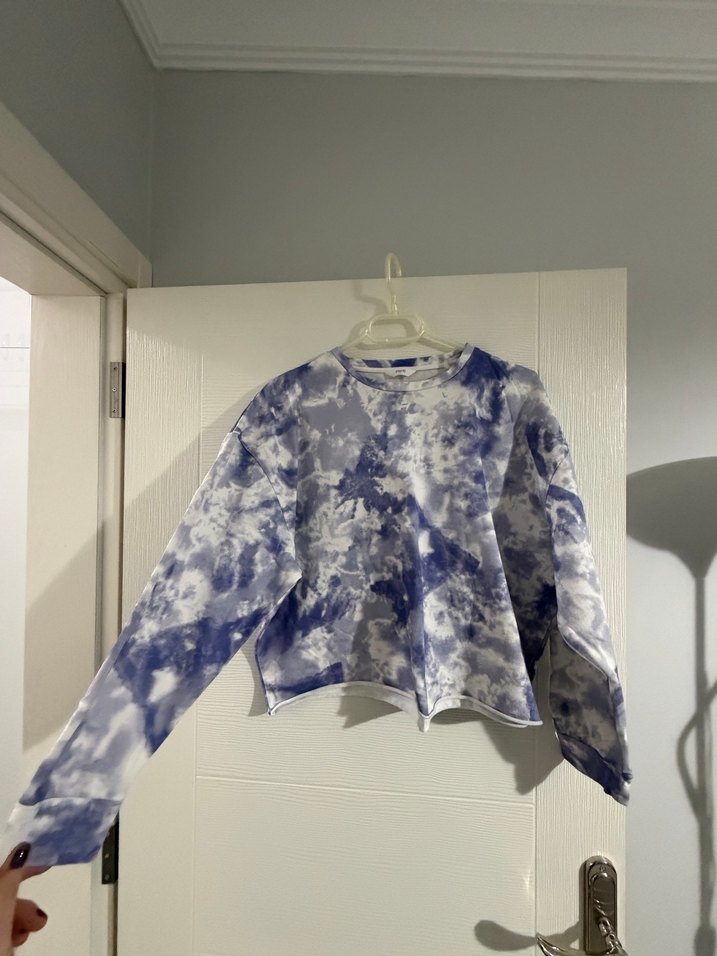 Kadın sweatshirt, pamuk kumaştan, uzun kollu, bisiklet yaka ve bol kesim. Mor ve gri batik desenli, rahat ve şık bir sokak stili sunar. Penti markadır hiç kullanılmadı