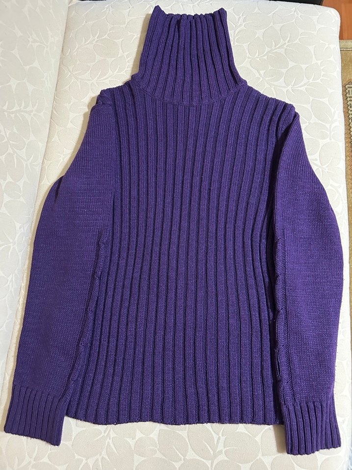 Bu koyu mor kadın kazağı, boğazlı ve uzun kollu, vücuda oturan kesime sahiptir. Triko kumaştan örülmüş sade ve rahat tasarımıyla günlük kullanıma uygundur. S-m bedene olur