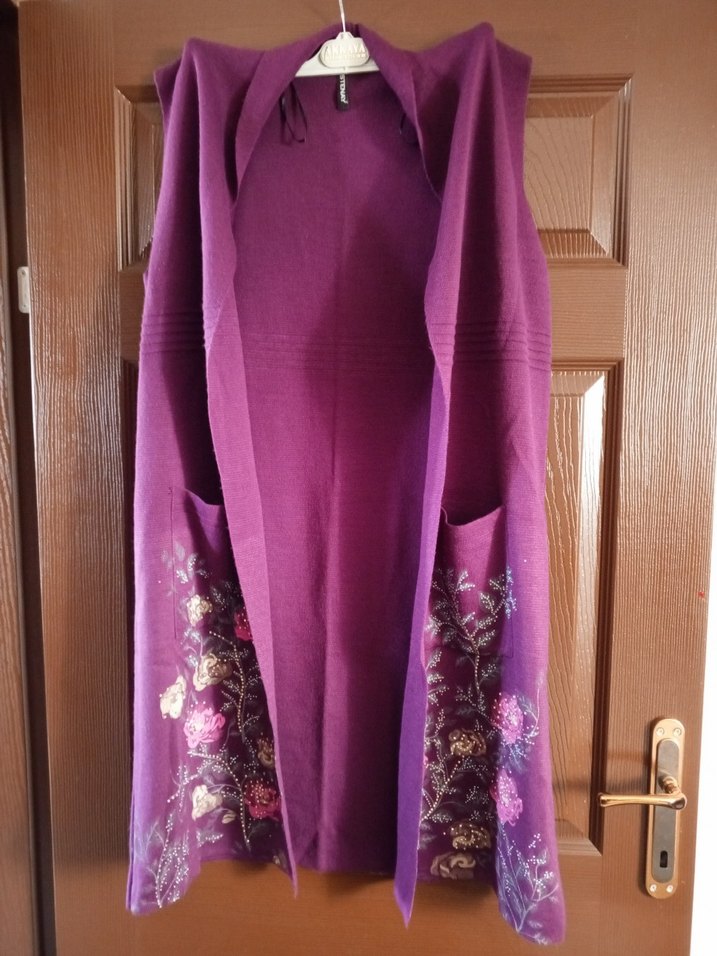 Kadınlar için uzun mor renkli, bol kesim ve kolsuz, bohem tarzda nakış detaylı yelektir.