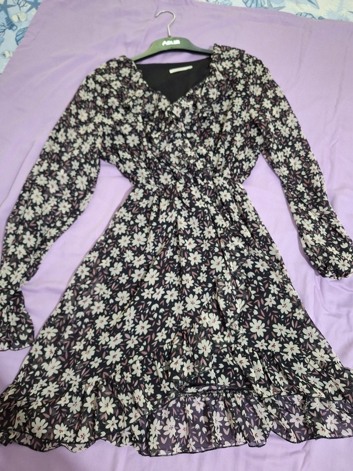 Mor renkli, uzun kollu ve V yaka midi elbise. Çiçek desenli, bol kesim ve fırfır detaylıdır, rahat ve bohem tarzda bir üründür.