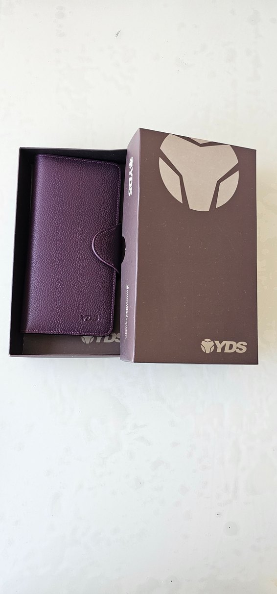 Koyu mor renkte deri cüzdan, fermuarlı ve baskılı desene sahip. Günlük kullanıma uygun, iş stiline uyumlu, "YYDS" markalı.