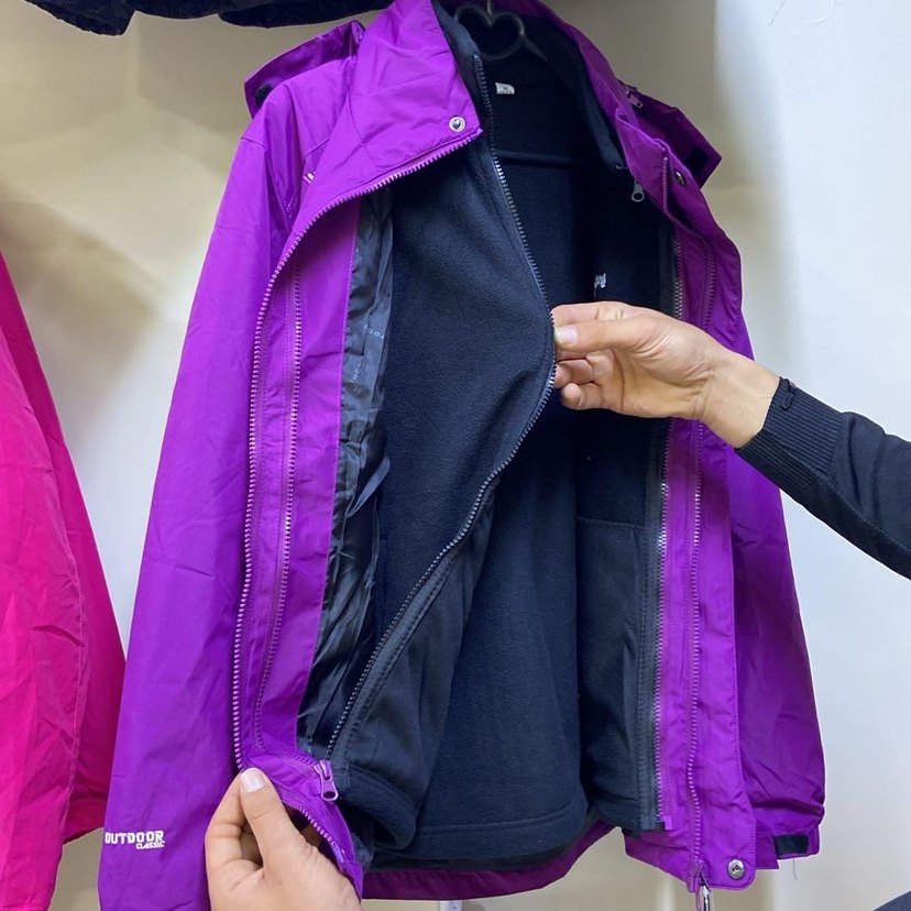 Kadın mor renkli, yüksek yakalı, fermuarlı ve uzun kollu ceket. Yumuşak ve sıcak kumaştan, sokak ve spor tarzını birleştirir. Dış mekan kullanımı için uygundur.