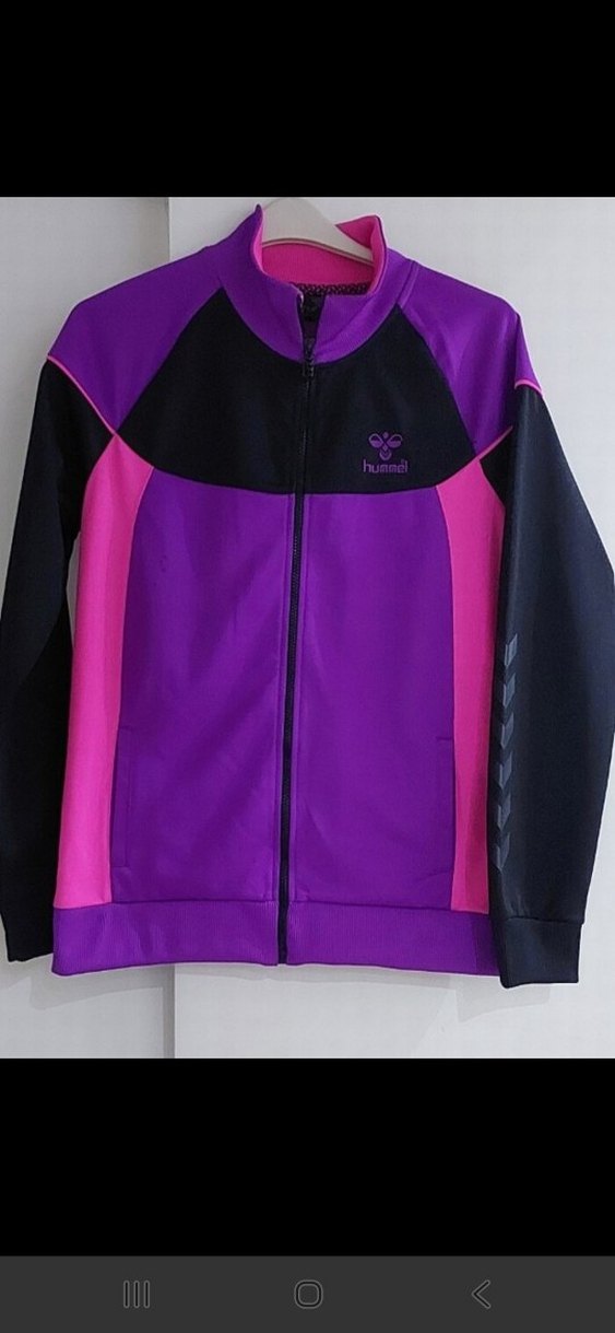 Hummel markalı, uzun kollu, yüksek yakalı ve fermuarlı bu dar kesim kadın ceket; koyu mor, siyah ve pembe renklerle baskılı detaylara sahip, spor sokak giyimine uygundur. Çok az kullanildi fazlaliktan satıliktır.İki kol arasi 54cm boy 72 cm