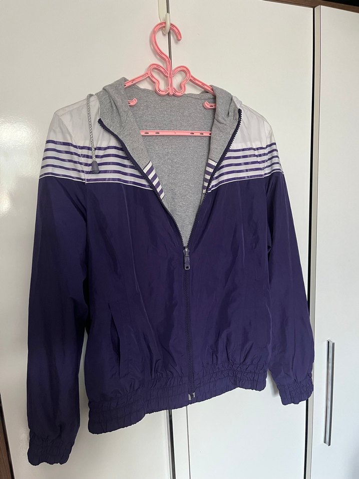 Kadın mor kapüşonlu fermuarlı yağmurluk, uzun kollu ve midi boydadır. Gri kapüşon astarı ve çizgili detaylarıyla sokak stiline uygundur.İki taraflı giyiliyor.