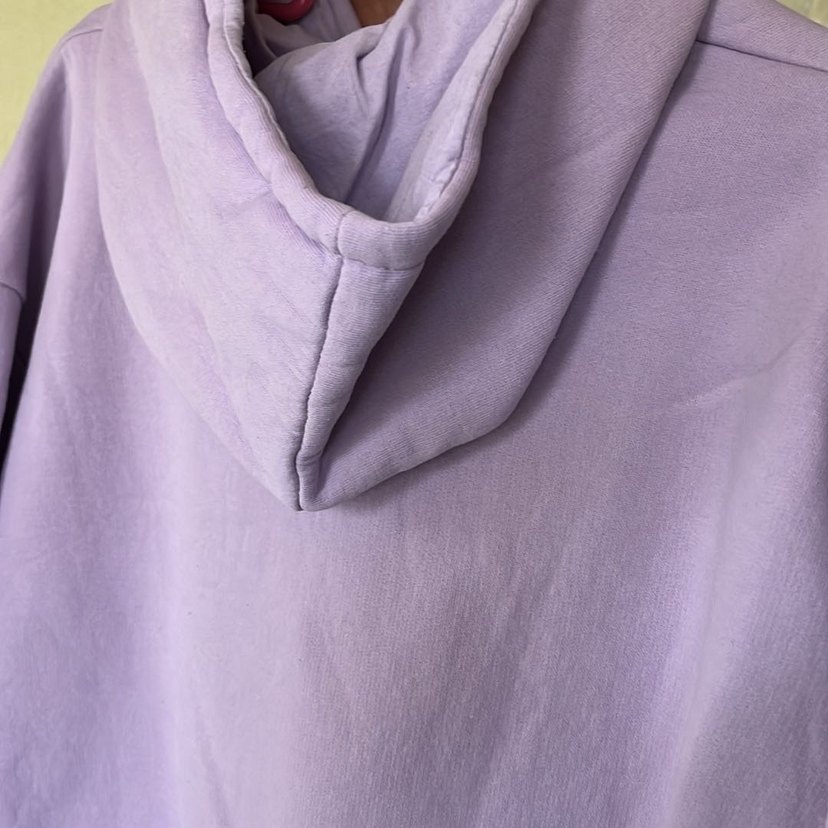 Kadınlar için keten kumaştan yapılmış, pastel mor renkte bol kesim sweatshirt. Kapüşonlu ve uzun kollu, rahat ve salaş bir stil sunar, günlük kullanım için uygundur.