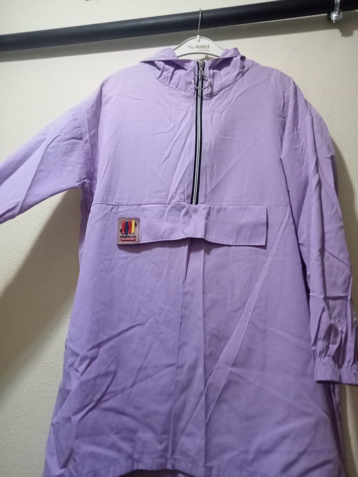 Bu kadın yağmurluğu pastel mor renkte, uzun kollu ve kapüşonludur. Bol kesim, kısa boy ve fermuarlı ön yapıya sahiptir. Yumuşak ve sıcak tutan kumaştandır. ️
