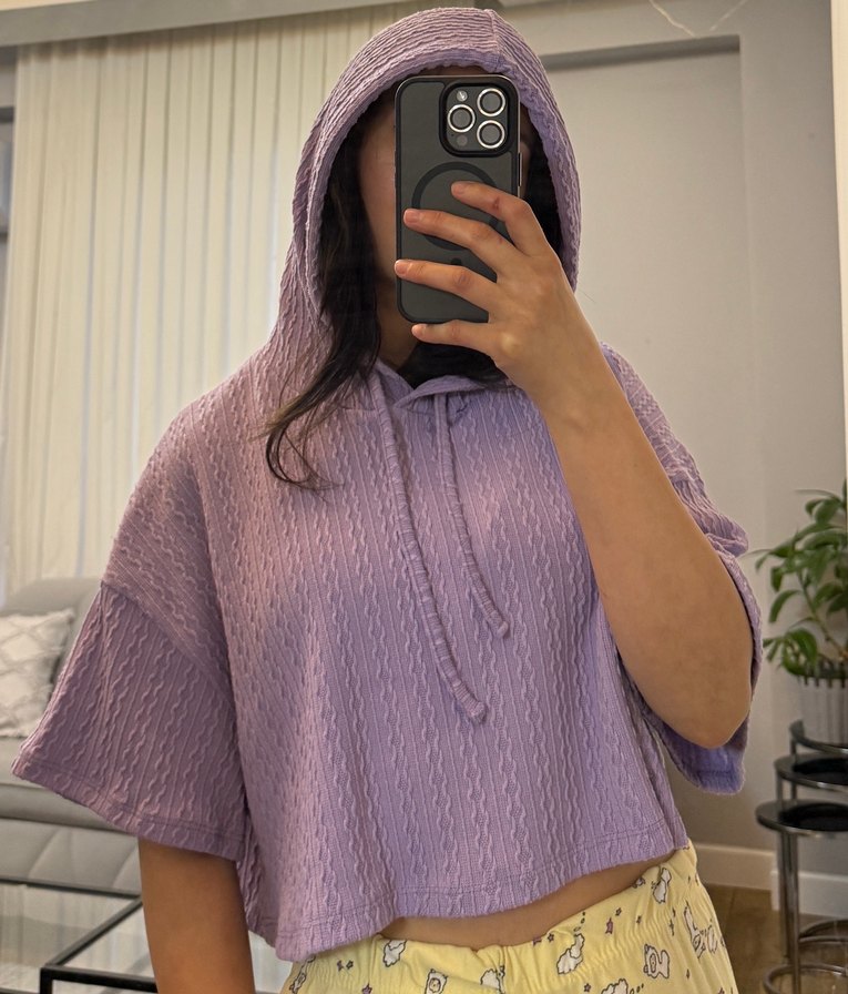 Mor renkli, örgü dokulu, kısa kollu ve kapüşonlu, rahat kesim midi uzunluğunda sweatshirt. Günlük sokak stili için ideal, pastel tonlarda trendy bir parça. Ürün çok az kullanılmış olup hiçbir defosu bulunmamaktadır.