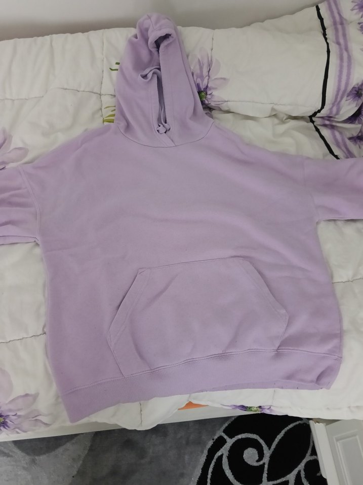 Yumuşak polar kumaştan, uzun kollu ve kapüşonlu, fermuarlı detaylı pastel mor renkli salaş kesim sweatshirt. Günlük rahat kullanım için uygundur. S beden ama M ve L bedene kadar uyar