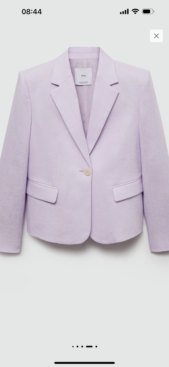 Mor keten kumaştan, yakası kesimli ve düğmeli, normal kesim uzun kollu blazer ceket. Ofis için modern ve desen içermeyen tasarım. Mango marka S beden #mango #blazer #keten #ketenceket