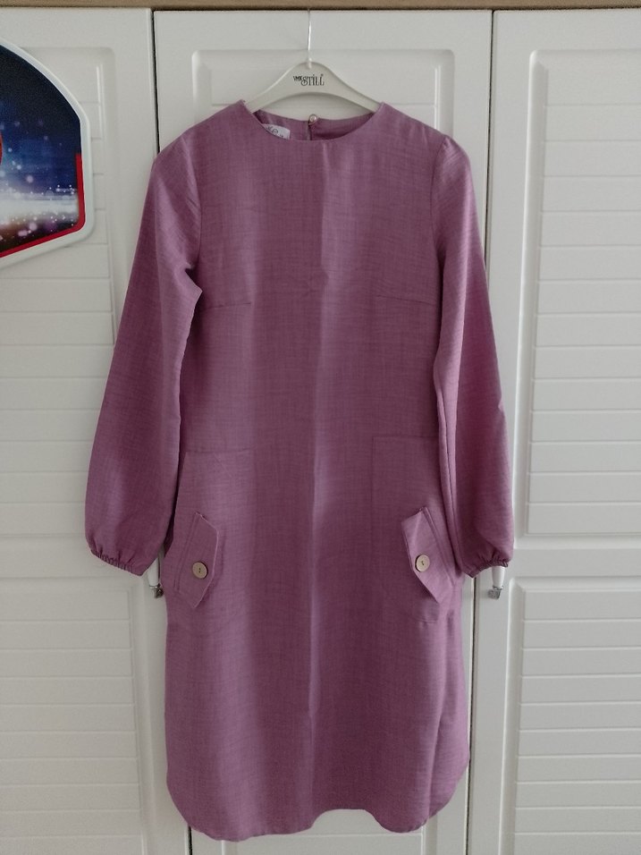 Kadınlar için pastel mor renkte, keten kumaştan, düğmeli ve uzun kollu midi tunik. Salaş kesimi ve yuvarlak yaka detayıyla minimalist tasarım sunar.
