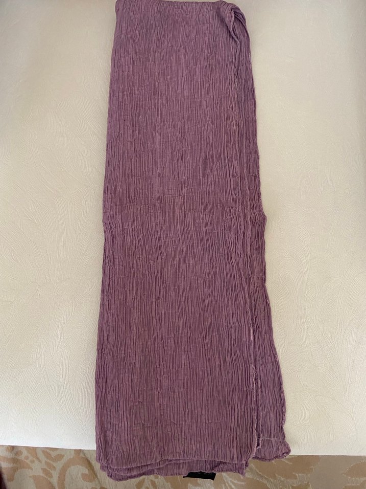 Kadınlar için koyu mor renkte, keten kumaştan yapılmış pilili ve bohem tarzda rahat bir şal.
