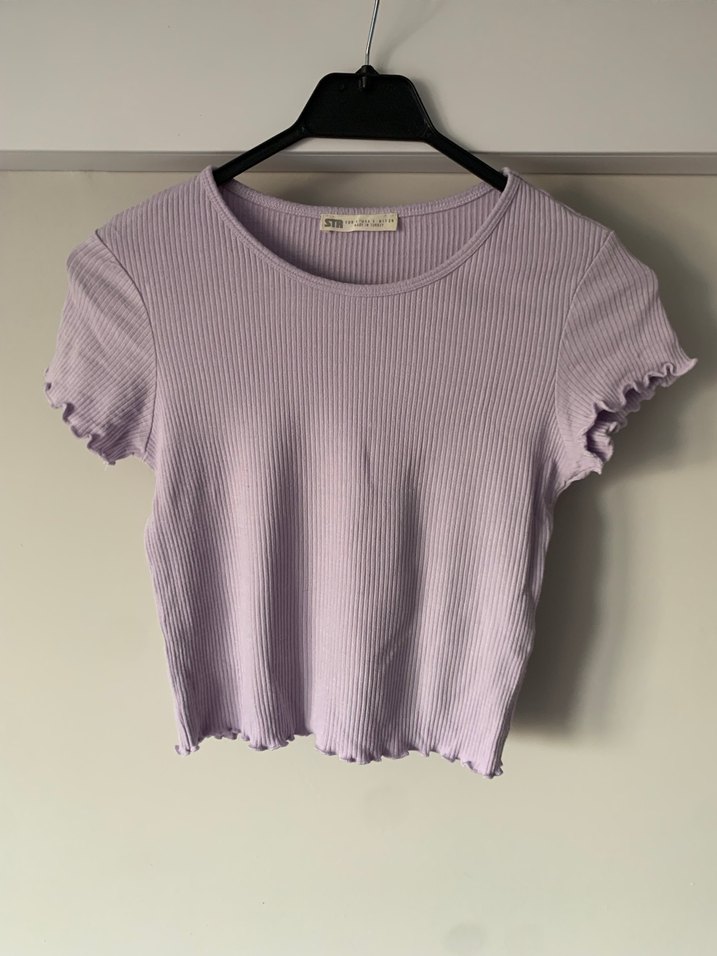 Mor renkli, kısa kollu ve fırfırlı kenarlara sahip kadın tişörtü. Pamuksu yumuşak keten kumaştan, kısa boylu ve sade tasarımlı, günlük kullanıma uygun.