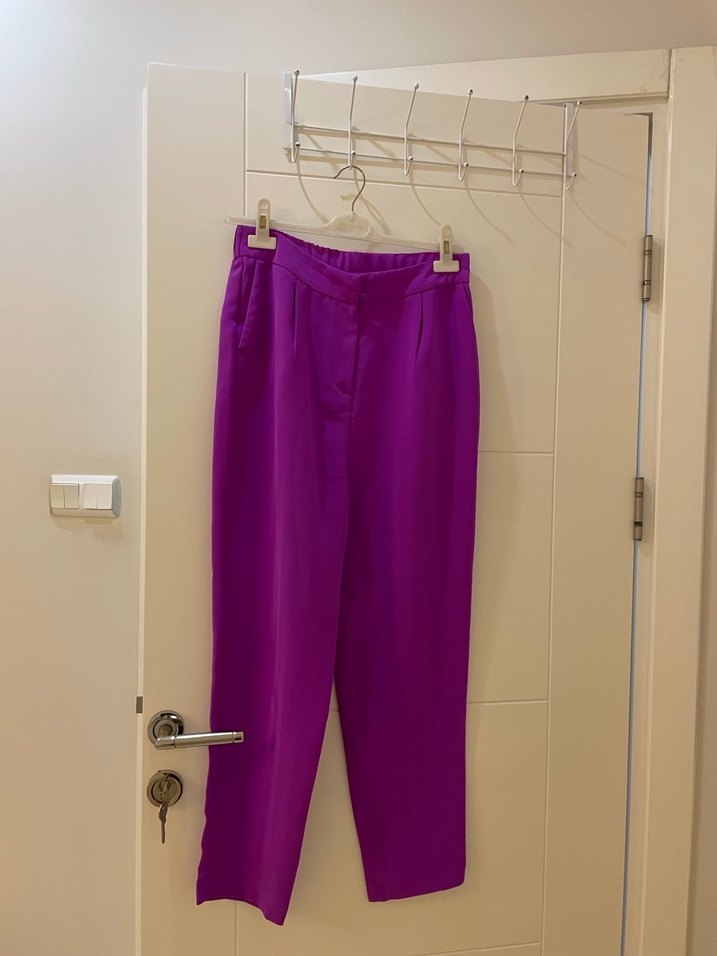 Kadınlar için parlak mor saten kumaştan, midi boy, düğmeli ve regular fit pantolon. Minimalist tarzda, ofis için uygundur.
