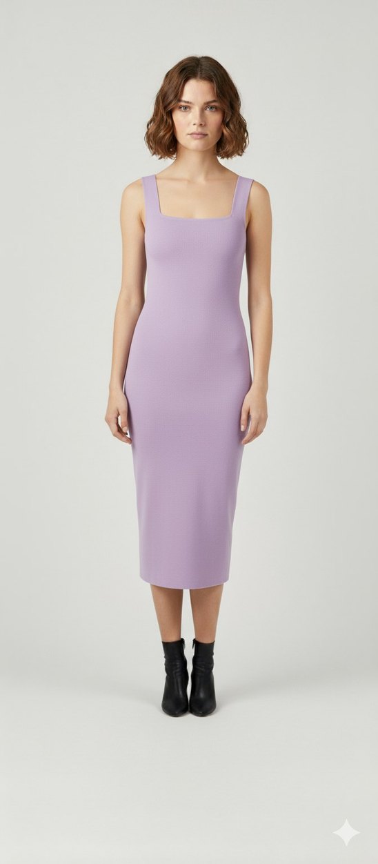 Mor renkli, kolsuz kalem elbise, düz yakalı ve vücuda oturan kesimlidir. Pürüzsüz sentetik kumaştan yapılmış, minimalist tarzıyla ofis için uygundur.