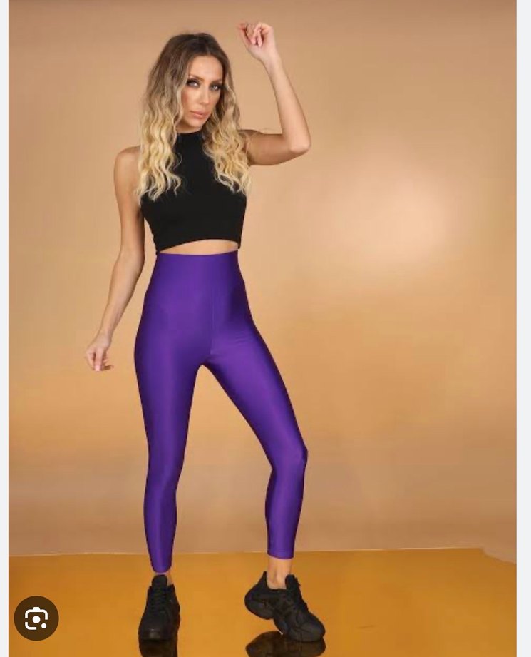 Kadınlar için mor, midi boy, ince kesim ve ipeksi dokulu spor tayt. Rahat ve şık, spor için uygun.
