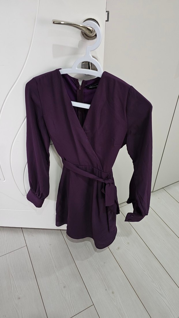 Mor renk, midi boy, uzun kollu ve kuşaklı bu kadın elbisesi minimalist sokak stili sunar. Koyu canlı renktedir.
