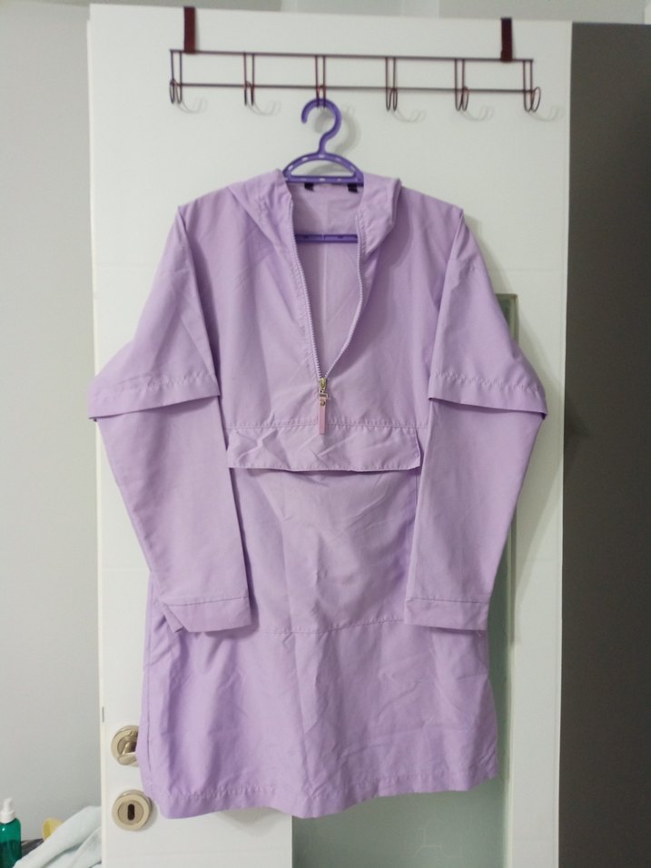 Mor pastel renkte, sentetik kumaştan üretilmiş, midi boy ve bol kesim kadın yağmurluk. Uzun kollu, yakası kesik ve desensiz, minimal ve normcore tarzda, günlük kullanıma uygun, zahmetsiz şıklık sunar. ️