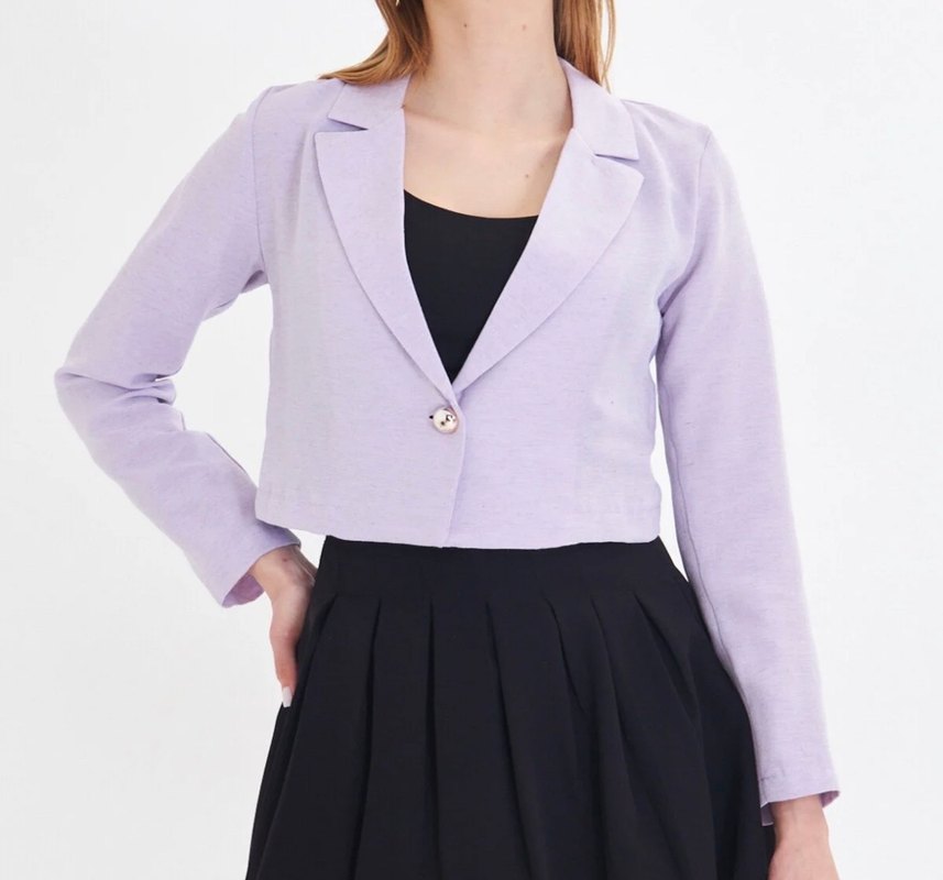 Pastel mor renkte, düğmeli, kısa kesim kadın blazer ceket. Uzun kollu, regular fit ve desen içermeyen bu model ofis için uygundur.