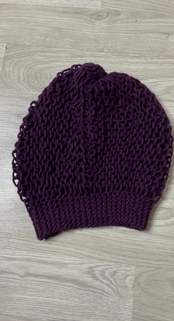 Kadınlar için koyu mor renkte, yumuşak iplikten örülmüş, rahat ve sade goth tarzı örgü bere.