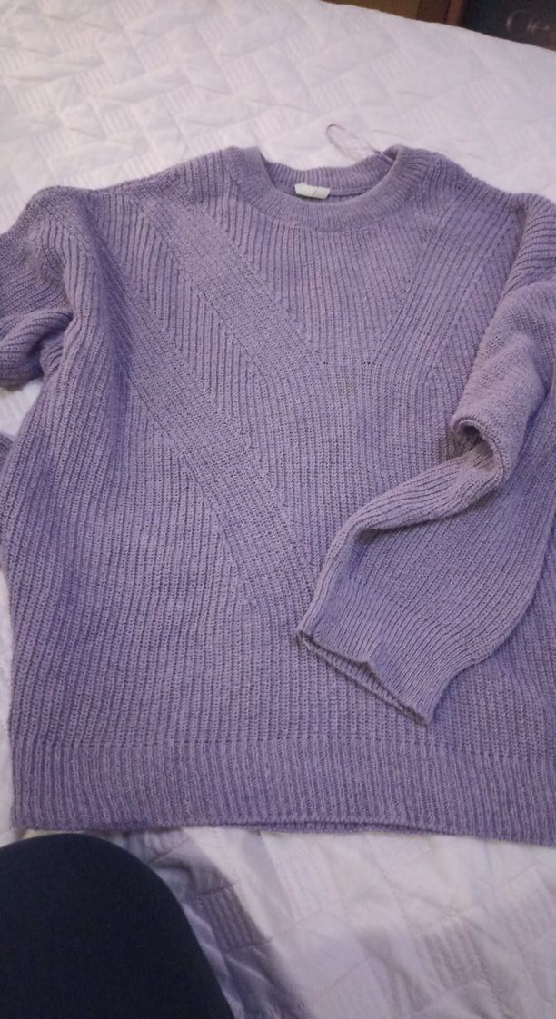 Kadınlar için pastel mor renkte, örgü kumaştan yapılmış bisiklet yaka, uzun kollu, bol kesim ve normal uzunlukta kazak. Günlük rahat kullanım için uygundur.