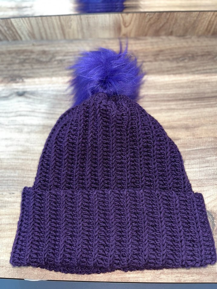 Kadınlar için koyu mor renkli, yumuşak örgü dokulu ve üstünde tüylü ponpon bulunan bere. Rahat bir tarz sağlar. El yapımı Hiç kullanılmadı sıfır