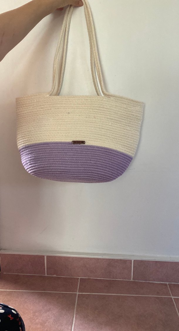 Kadınlar için pamuk malzemeden yapılmış, pastel mor ve krem renkli, desen içermeyen, bohem tarzda sade plaj çantasıdır.