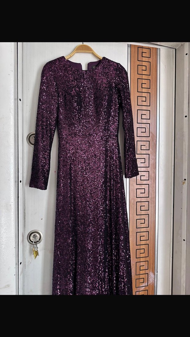 Mor renkte, payetli ve yılan deseni detaylı uzun abiye elbise. Uzun kollu ve tekne yaka tasarımıyla modern klasik tarzda, partiler için ideal bir seçimdir. ✨